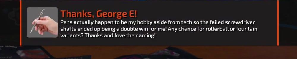 Pens actually happen to be my hobby aside from tech so the failed screwdriver shafts ended up being a double win for me! Any chance for rollerball or fountain variants? Thanks and love the naming!