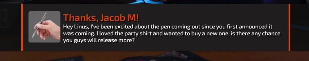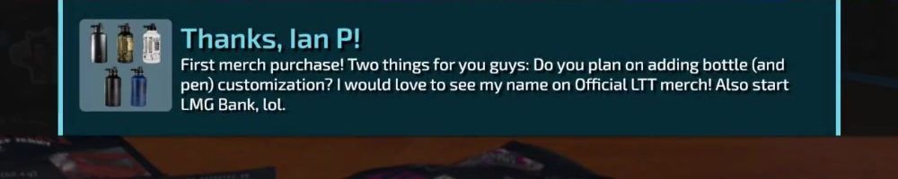 First merch purchase! Two things for you guys: Do you plan on adding bottle (and pen) customization? I would love to see my name on Official LTT merch! Also start LMG Bank, lol.