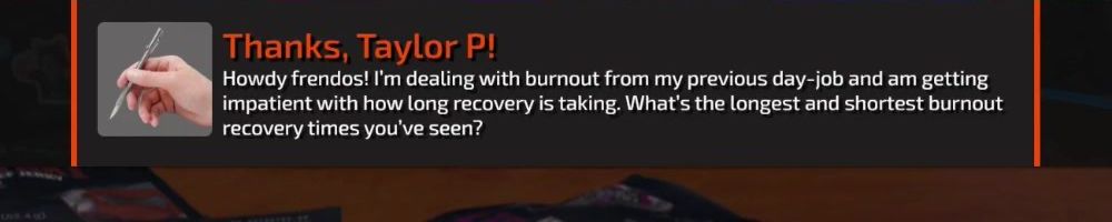 Howdy frendos! I'm dealing with burnout from my previous day-job and am getting impatient with how long recovery is taking. What's the longest and shortest burnout recovery times you've seen?