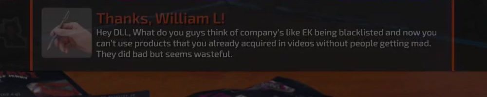Hey DLL, What do you guys think of company’s like EK being blacklisted and now you can't use products that you already acquired in videos without people getting mad. They did bad but seems wasteful.