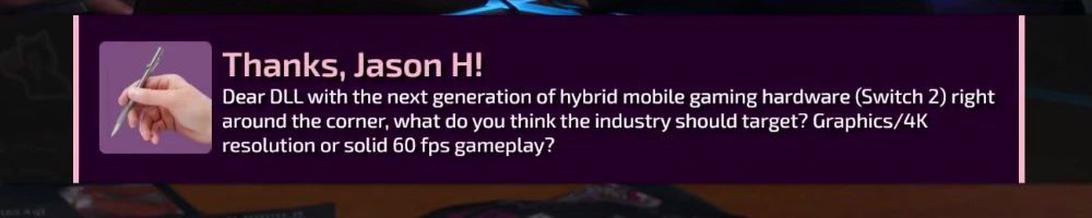 Dear DLL with the next generation of hybrid mobile gaming hardware (Switch 2) right around the corner, what do you think the industry should target? Graphics/4K resolution or solid 60 fps gameplay?