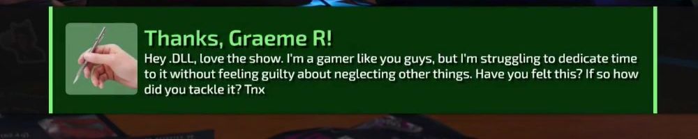 Hey .DLL, love the show. I'm a gamer like you guys, but I'm struggling to dedicate time to it without feeling guilty about neglecting other things. Have you felt this? If so how did you tackle it? Tnx