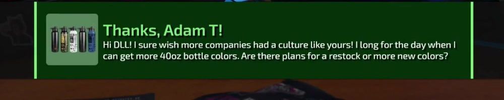 Hi DLL! I sure wish more companies had a culture like yours! I long for the day when I can get more 40oz bottle colors. Are there plans for a restock or more new colors?