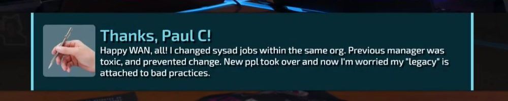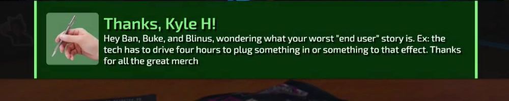 Hey Ban, Buke, and Blinus, wondering what your worst "end user" story is. Ex: the tech has to drive four hours to plug something in or something to that effect. Thanks for all the great merch