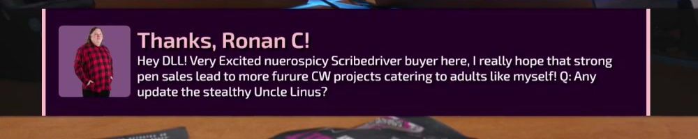 Hey DLL! Very Excited nuerospicy Scribedriver buyer here, I really hope that strong pen sales lead to more furure CW projects catering to adults like myself! Q: Any update the stealthy Uncle Linus?
