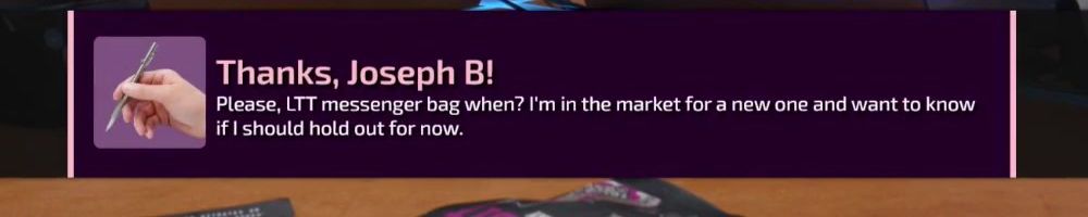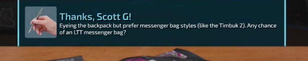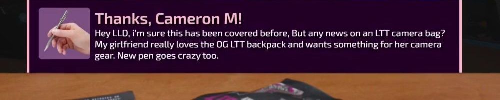 Hey LLD, i'm sure this has been covered before, But any news on an LTT camera bag? My girlfriend really loves the OG LTT backpack and wants something for her camera gear. New pen goes crazy too.