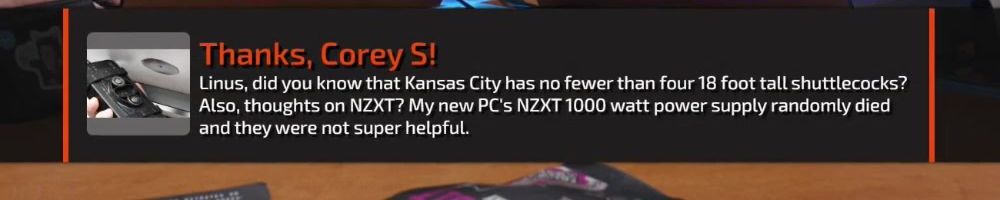Linus, did you know that Kansas City has no fewer than four 18 foot tall shuttlecocks? Also, thoughts on NZXT? My new PC's NZXT 1000 watt power supply randomly died and they were not super helpful.