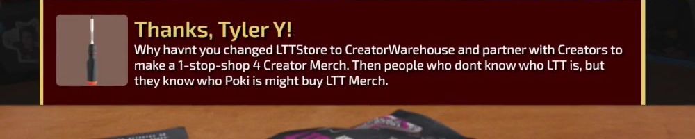 Why havnt you changed LTTStore to CreatorWarehouse and partner with Creators to make a 1-stop-shop 4 Creator Merch. Then people who dont know who LTT is, but they know who Poki is might buy LTT Merch.