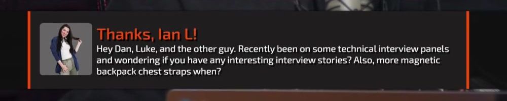 Hey Dan, Luke, and the other guy. Recently been on some technical interview panels and wondering if you have any interesting interview stories? Also, more magnetic backpack chest straps when?