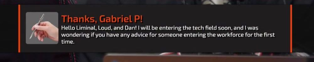 Hello Liminal, Loud, and Dan! I will be entering the tech field soon, and I was wondering if you have any advice for someone entering the workforce for the first time.