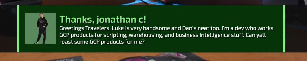 Greetings Travelers. Luke is very handsome and Dan's neat too. I'm a dev who works GCP products for scripting, warehousing, and business intelligence stuff. Can yall roast some GCP products for me?