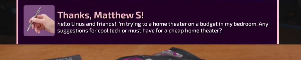 hello Linus and friends! I'm trying to a home theater on a budget in my bedroom. Any suggestions for cool tech or must have for a cheap home theater?