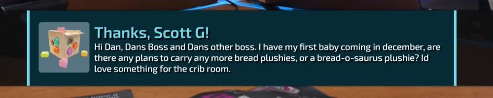 Hi Dan, Dans Boss and Dans other boss. I have my first baby coming in december, are there any plans to carry any more bread plushies, or a bread-o-saurus plushie? Id love something for the crib room.