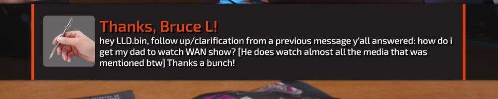 Hint: Use CTRL + F to search messages in this show, or use Whenplane's WAN Show Search tool to search for messages in all shows.