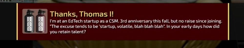 "The excuse tends to be 'startup, volatile, blah blah blah". In your early days how did you retain talent?