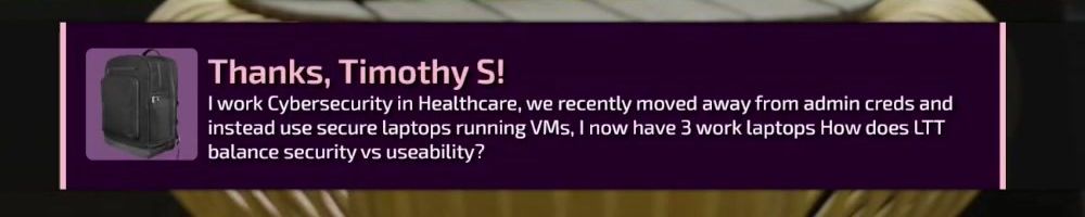 I work Cybersecurity in Healthcare, we recently moved away from admin creds and instead use secure laptops running VMs, I now have 3 work laptops How does LTT balance security vs useability?