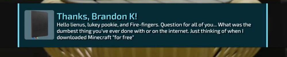 Hello lienus, lukey pookie, and Fire-fingers. Question for all of you... What was the dumbest thing you've ever done with or on the internet. Just thinking of when I downloaded Minecraft "for free"