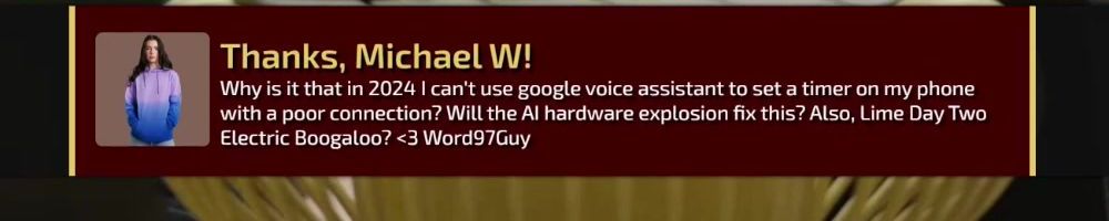 Why is it that in 2024 I can't use google voice assistant to set a timer on my phone with a poor connection? Will the AI hardware explosion fix this? Also, Lime Day Two Electric Boogaloo? <3 Word97Guy