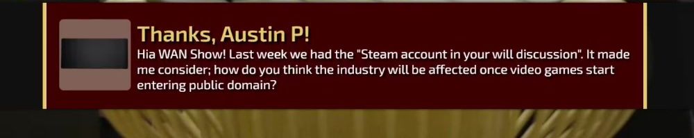 Hia WAN Show! Last week we had the "Steam account in your will discussion". It made me consider; how do you think the industry will be affected once video games start entering public domain?