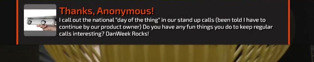 I call out the national "day of the thing" in our stand up calls (been told I have to continue by our product owner) Do you have any fun things you do to keep regular calls interesting? DanWeek Rocks!
