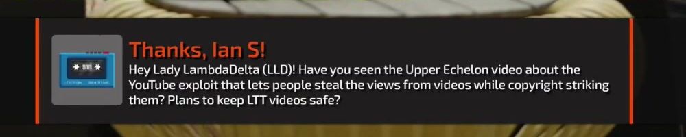 Hey Lady LambdaDelta (LLD)! Have you seen the Upper Echelon video about the YouTube exploit that lets people steal the views from videos while copyright striking them? Plans to keep LTT videos safe?