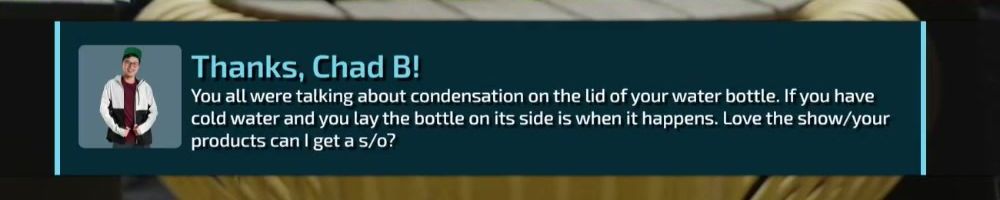 You all were talking about condensation on the lid of your water bottle. If you have