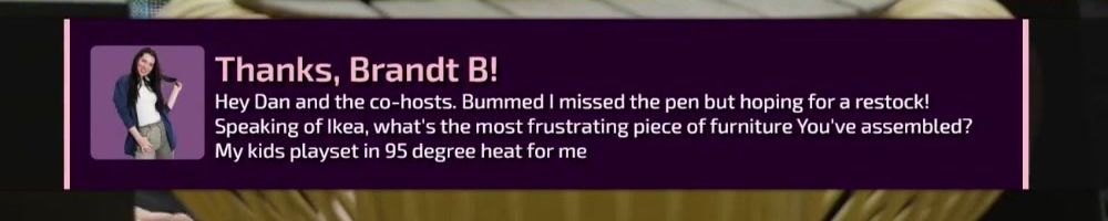 Hey Dan and the co-hosts. Bummed I missed the pen but hoping for a restock! Speaking of Ikea, what's the most frustrating piece of furniture You've assembled? My kids playset in 95 degree heat for me