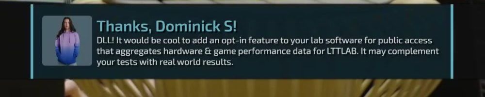 DLL! It would be cool to add an opt-in feature to your lab software for public access that aggregates hardware & game performance data for LTTLAB. It may complement your tests with real world results.