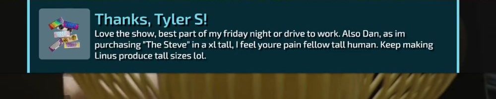 Love the show, best part of my friday night or drive to work. Also Dan, as im purchasing "The Steve" in a xl tall, I feel youre pain fellow tall human. Keep making Linus produce tall sizes lol.
