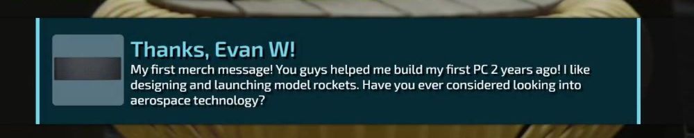 My first merch message! You guys helped me build my first PC 2 years ago! I like designing and launching model rockets. Have you ever considered looking into aerospace technology?