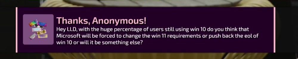 Hey LLD, with the huge percentage of users still using win 10 do you think that Microsoft will be forced to change the win 11 requirements or push back the eol of win 10 or will it be something else?