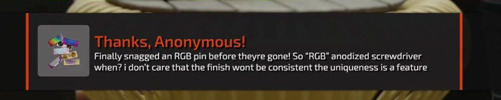 Finally snagged an RGB pin before theyre gone! So “RGB” anodized screwdriver when? i don't care that the finish wont be consistent the uniqueness is a feature
