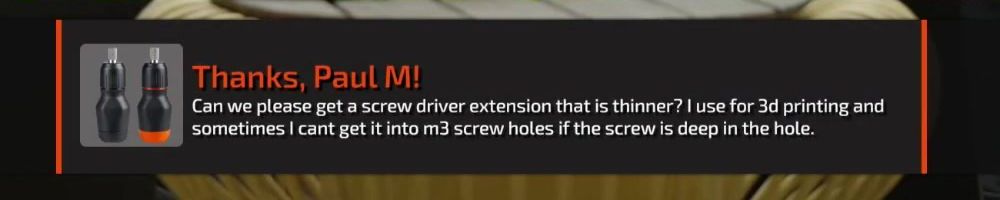 Can we please get a screw driver extension that is thinner? I use for 3d printing and sometimes I can't get it into m3 screw holes if the screw is deep in the hole.
