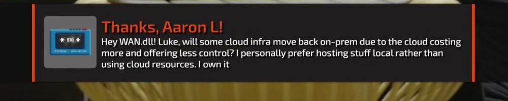 Hey WAN.dLL! Luke, will some cloud infra move back on-prem due to the cloud costing more and offering less control? I personally prefer hosting stuff local rather than using cloud resources. I own it