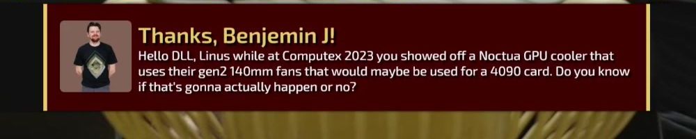 Hello DLL, Linus while at Computex 2023 you showed off a Noctua GPU cooler that uses their gen2 140mm fans that would maybe be used for a 4090 card. Do you know if that's gonna actually happen or no?