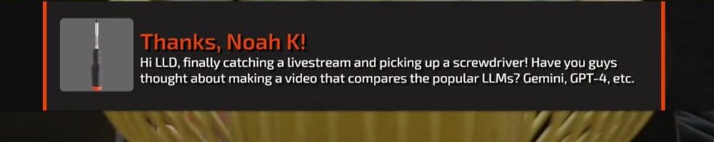 Hi LLD, finally catching a livestream and picking up a screwdriver! Have you guys thought about making a video that compares the popular LLMs? Gemini, GPT-4, etc.