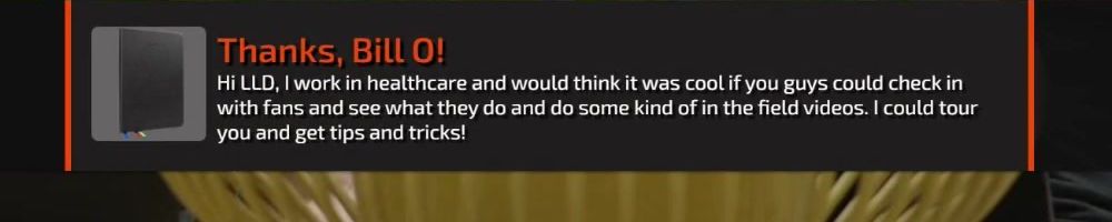 Hi LLD, I work in healthcare and would think it was cool if you guys could check in with fans and see what they do and do some kind of in the field videos. I could tour you and get tips and tricks!
