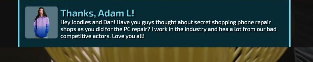 Hey loodles and Dan! Have you guys thought about secret shopping phone repair shops as you did for the PC repair? I work in the industry and hea a lot from our bad competitive actors. Love you all!