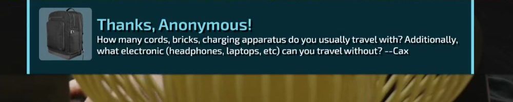 How many cords, bricks, charging apparatus do you usually travel with? Additionally, what electronic (headphones, laptops, etc) can you travel without? --Cax