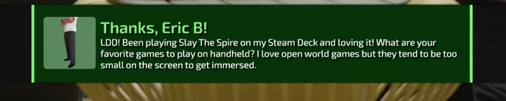 LDD! Been playing Slay The Spire on my Steam Deck and loving it! What are your favorite games to play on handheld? I love open world games but they tend to be too small on the screen to get immersed.
