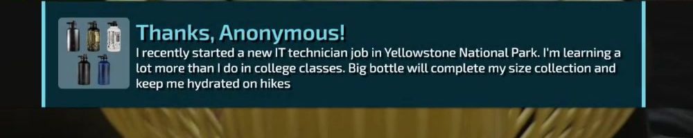 I recently started a new IT technician job in Yellowstone National Park. I'm learning a lot more than I do in college classes. Big bottle will complete my size collection and keep me hydrated on hikes