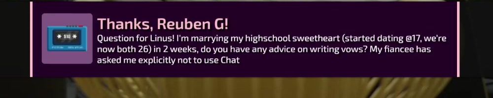 Question for Linus! I'm marrying my highschool sweetheart (started dating @17, we're now both 26) in 2 weeks, do you have any advice on writing vows? My fiancee has asked me explicitly not to use Chat