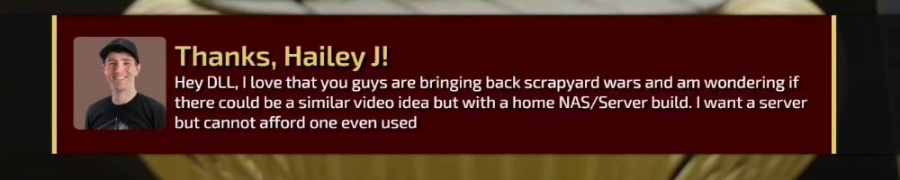 Hey DLL, I love that you guys are bringing back scrapyard wars and am wondering if there could be a similar video idea but with a home NAS/Server build. I want a server but cannot afford one even used