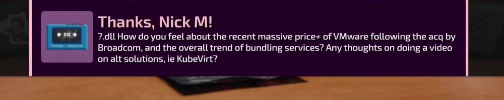 Thanks, Nick M! ?.dlL How do you feel about the recent massive price+ of VMware following the acq by Broadcom, and the overall trend of bundling services? Any thoughts on doing a video on alt solutions, ie KubeVirt?