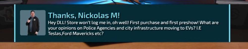 Thanks, Nickolas M! Hey DLL! Store won't log me in, oh well! First purchase and first preshow! What are your opinions on Police Agencies and city infrastructure moving to EVs? I.E Teslas,Ford Mavericks etc?
