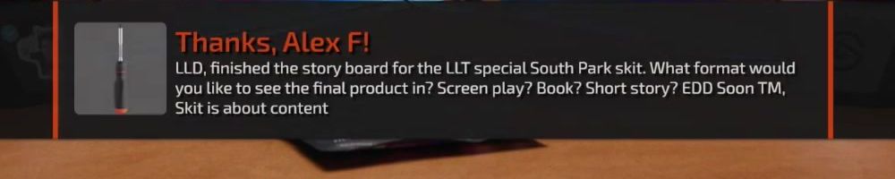 Thanks, Alex F! LLD, finished the story board for the LLT special South Park skit. What format would you like to see the final product in? Screen play? Book? Short story? EDD Soon TM, Skit is about content