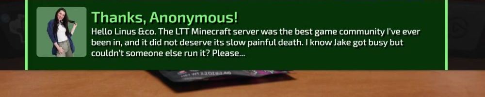 Thanks, Anonymous! Hello Linus &co. The LTT Minecraft server was the best game community I've ever been in, and it did not deserve its slow painful death. I know Jake got busy but couldn't someone else run it? Please...