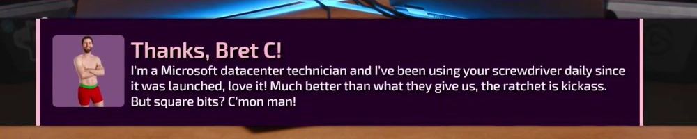 Thanks, Bret C! I'm a Microsoft datacenter technician and I've been using your screwdriver daily since it was launched, love it! Much better than what they give us, the ratchet is kickass. But square bits? C'mon man!