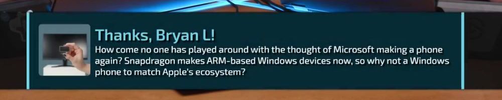 Thanks, Bryan L! How come no one has played around with the thought of Microsoft making a phone again? Snapdragon makes ARM-based Windows devices now, so why not a Windows phone to match Apple's ecosystem?
