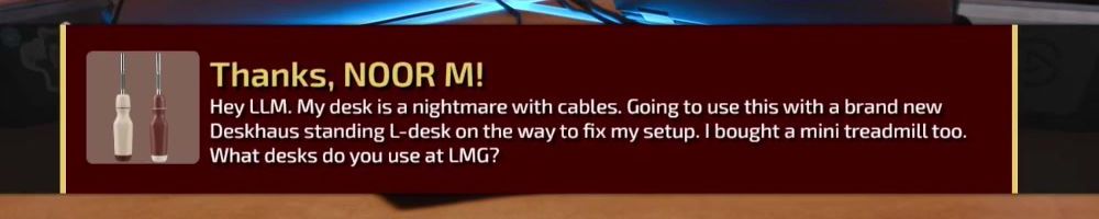 Thanks, NOOR M! Hey LLM. My desk is a nightmare with cables. Going to use this with a brand new Deskhaus standing L-desk on the way to fix my setup. I bought a mini treadmill too. What desks do you use at LMG?